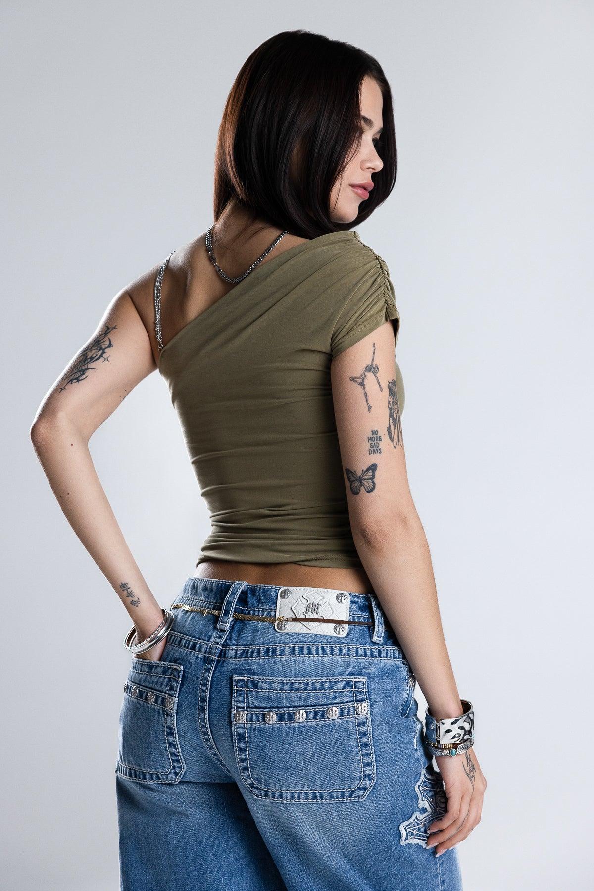 Effortless elegance meets modern style with this olive green draped top. The asymmetrical one-shoulder design creates a flattering silhouette while the soft draping adds movement and dimension. Perfect for dressing up or down, this versatile piece transitions seamlessly from day to night. The rich olive tone pairs beautifully with neutrals or bold accessories, making it a wardrobe essential for any occasion.