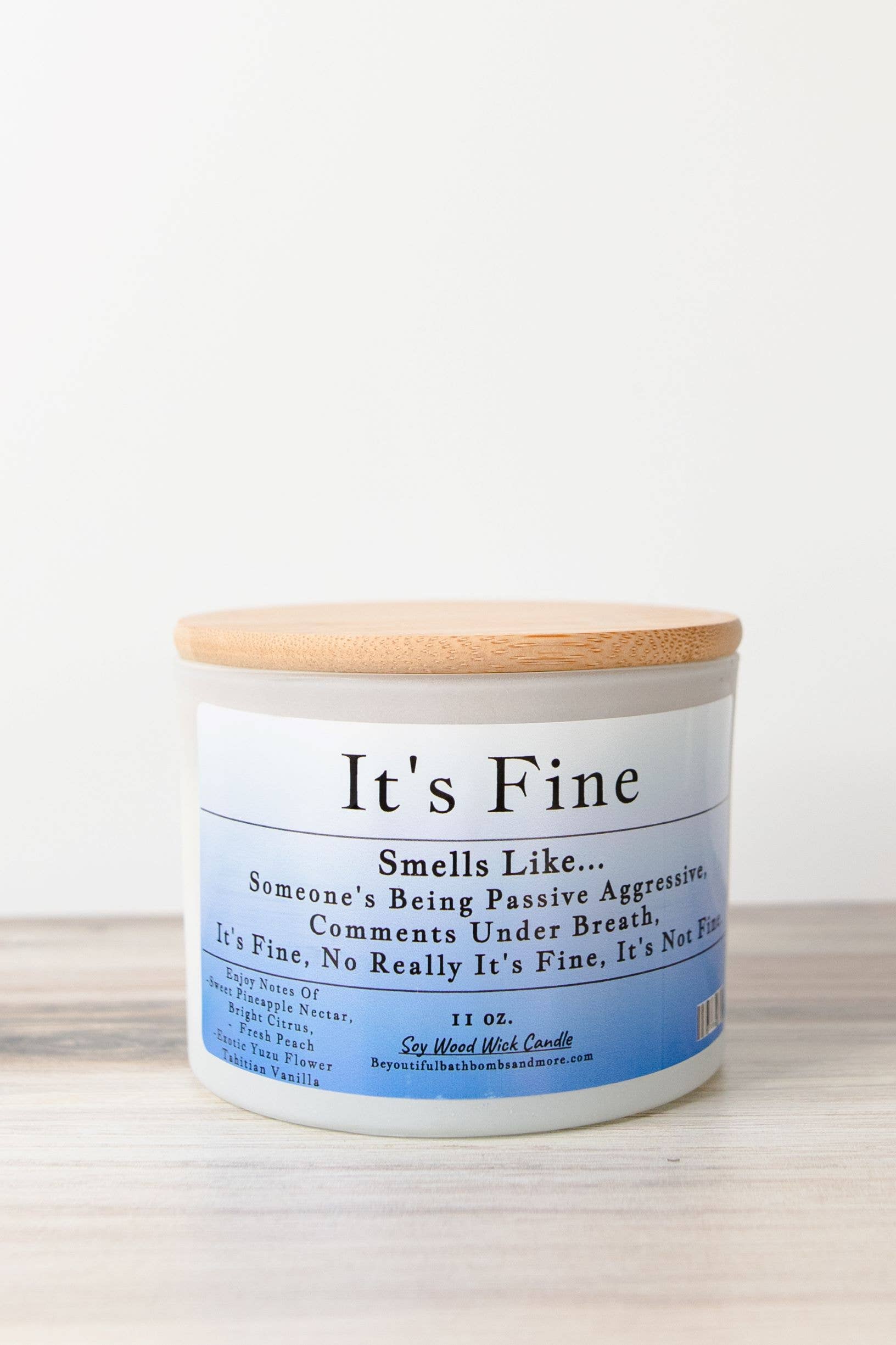 It's Fine: The perfect candle when you are so over the day. A luscious and juicy blend of sweet pineapple nectar, bright citrus, and succulent fresh peach is perfectly infused with exotic Yuzu flower and Tahitian vanilla to delight the senses.