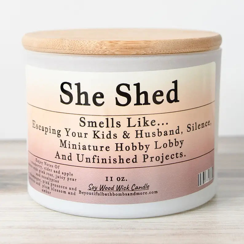 She Shed: For when you just need to escape everything! Lots of cranberry, cider and apple notes with pink rose, juicy pear and eucalyptus blended with sparkling champagne and quince, middle notes of pink prosecco and peonies and bottom notes of plum blossom and amber.