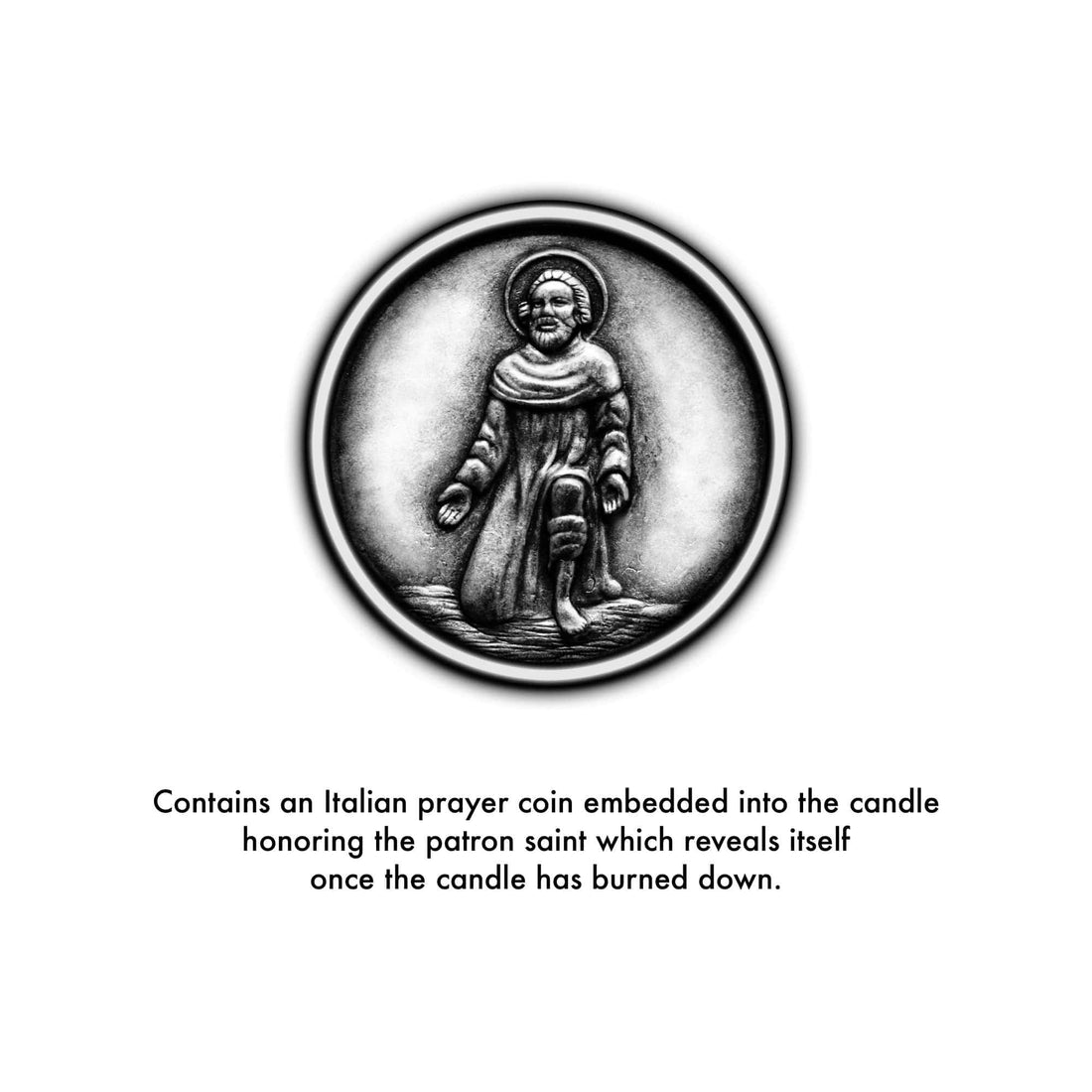 Each candle comes with a prayer to the patron saint and a prayer coin embedded in the wax. Before your first lighting, read the prayer to the patron saint, then light the candle.