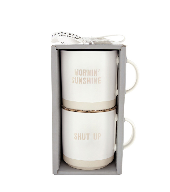 Pair your morning ritual with understated charm. This stackable ceramic mug set features two complementary designs—"Mornin Sunshine" and "Shut Up"—that layer beautifully on your shelf or stack neatly in your cabinet. Subtle typography and clean lines make them equally at home in minimalist kitchens or eclectic spaces.