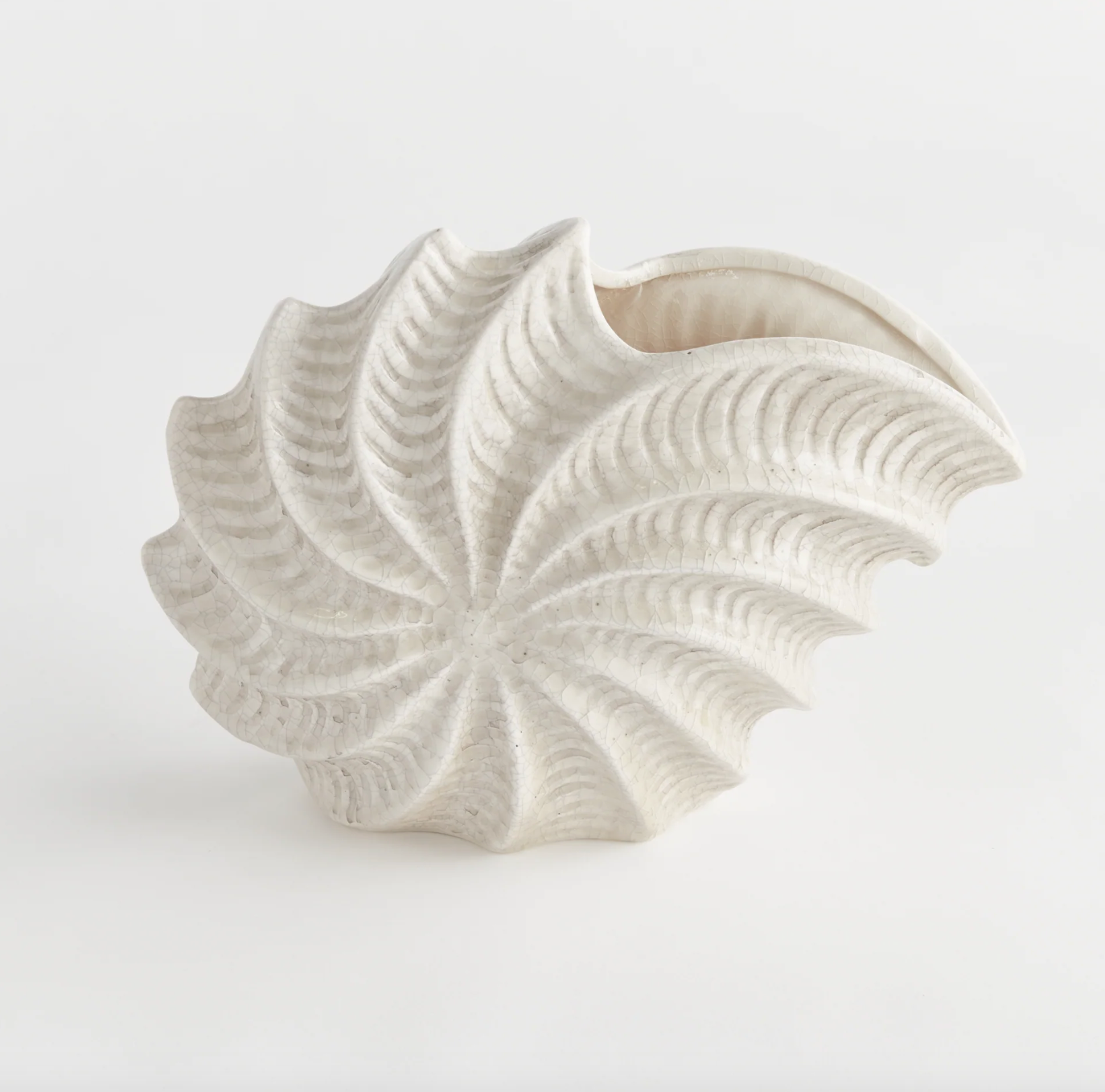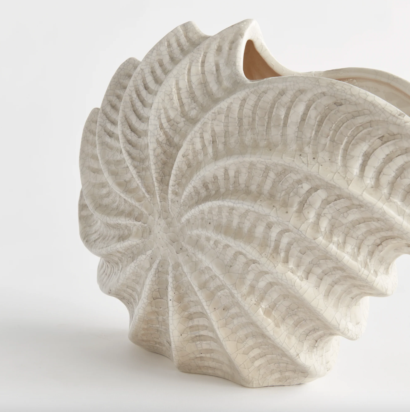 With an antique subtle crackle glaze, this generously scaled shell vase is a stunning accent. Whether on a side table, ottoman or kitchen island, it is an elegant homage to coastal living.