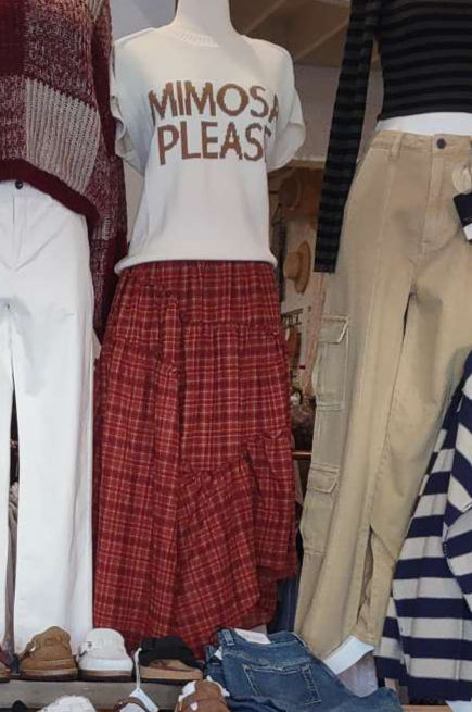 Embrace autumn vibes with the Ashley Handkerchief Ruffle Midi Skirt. This playful plaid skirt features a charming handkerchief hem and delicate ruffles, perfect for layering with cozy sweaters and boots. Its flattering midi length adds a flirty twist to your fall wardrobe, making every step feel breezy and fun. Elevate your seasonal style with this versatile skirt that blends classic pattern and whimsical design effortlessly.