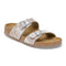 The BIRKENSTOCK Sydney has both form and function. With its two simple straps, it covers fashion and comfort. This version features silver-toned buckles and silky sheen finish. The upper is made from the skin-friendly, hard-wearing synthetic material Birko-Flor® with a silky sheen.