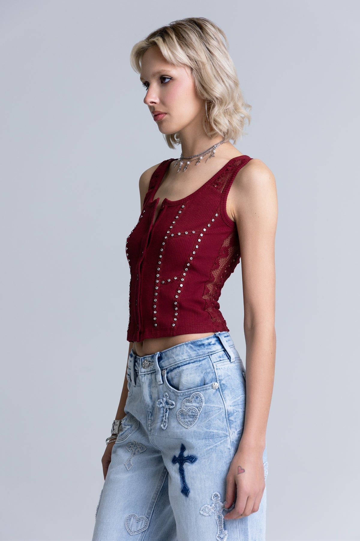 Elevate your casual style with this eye-catching rhinestone studded tank. Featuring sparkling embellishments across the front, this versatile piece adds instant glamour to any outfit. Perfect for layering or wearing solo, the classic tank silhouette offers comfort and timeless appeal. Pair with jeans for a night out or dress it up for special occasions. A wardrobe essential that brings sparkle and sophistication to your everyday look.