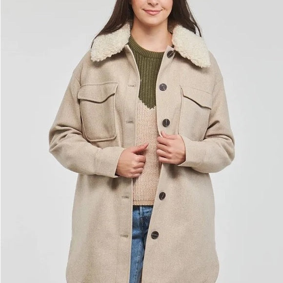 Embrace warmth and style with this Vero Moda teddy jacket, featuring a cozy cream sherpa collar and a relaxed fit. The tan color and mid-thigh length make it a versatile addition to your wardrobe, perfect for layering during cooler months.